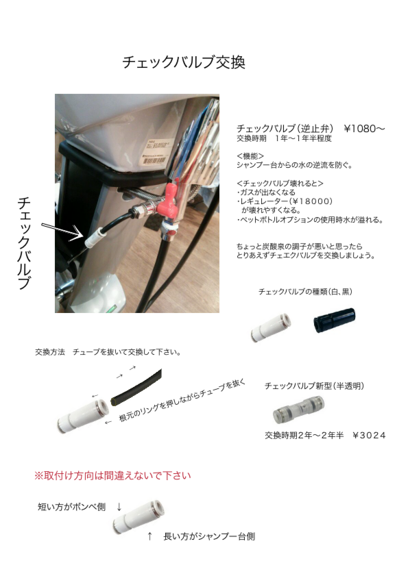 ⑤チェックバルブのシャンプー台側からチューブを抜いてガスチェックして下さい。