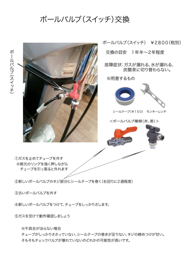 →ボンベ交換時に少し水が出てる →チェックバルブの故障です。新しく購入、交換して下さい。
